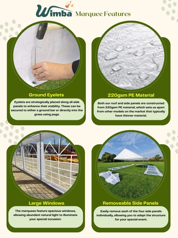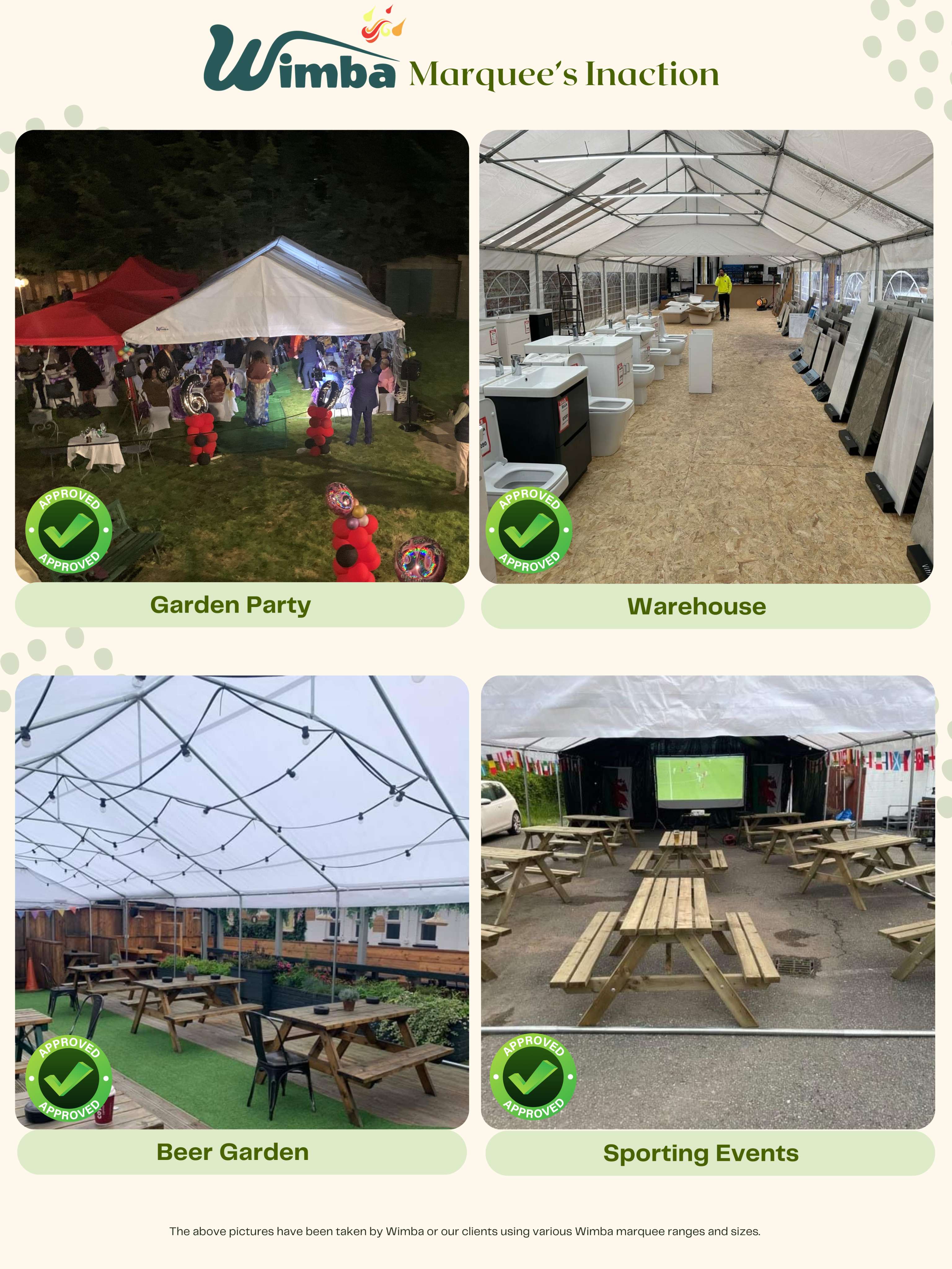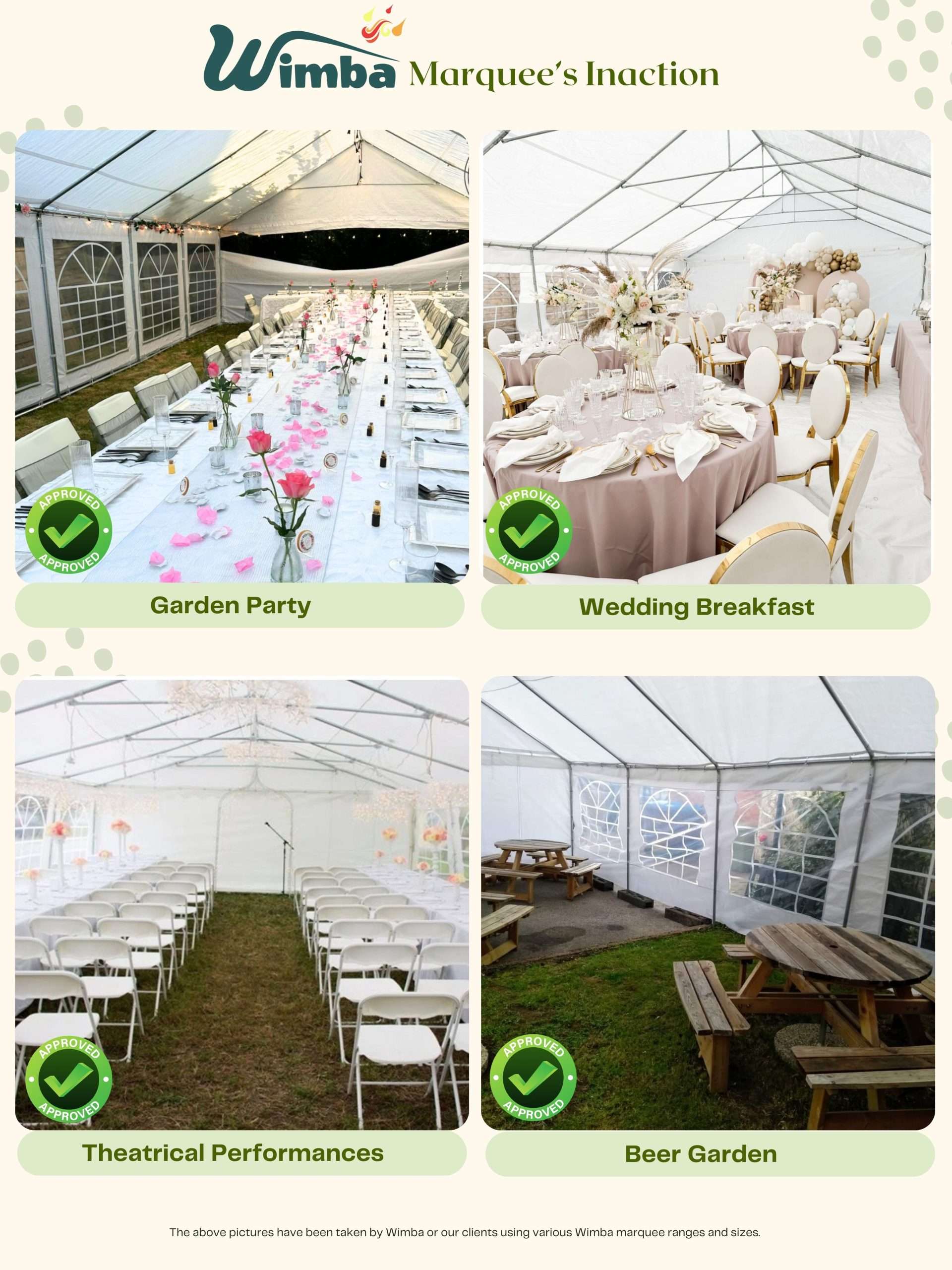 | Marquees are intended for events and other arrangements and are as such only meant for short term temporary assembly and disassembly. Wimba warranty applies only to the normal use of the product, normal wear and tear excepted, in accordance with written use instructions or manual. The warranty does not apply to damage caused by accident, abuse, weather conditions, misuse, modification or incorrect dismantle, erection, packing and storage of the product. |